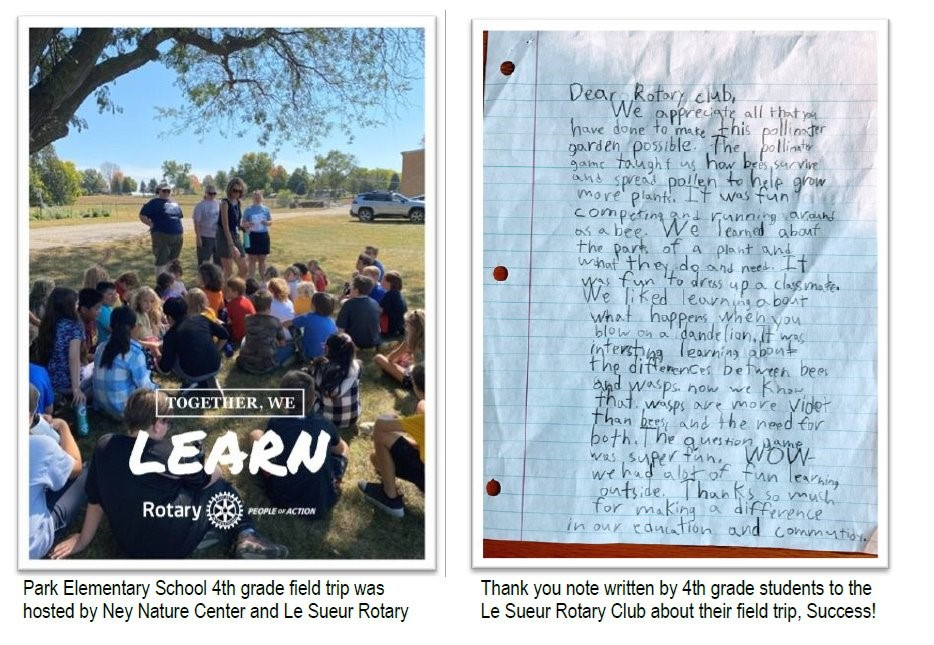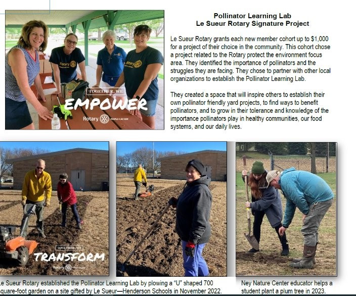 Le Sueur Rotary grants each new member cohort up to $1,000 for a community project of their choice. The cohort chose a project related to the Rotary Protect the Environment focus area. They identified the importance of pollinators and the struggles they face. They chose to partner with other local organizations to establish the Pollinator Learning Lab.