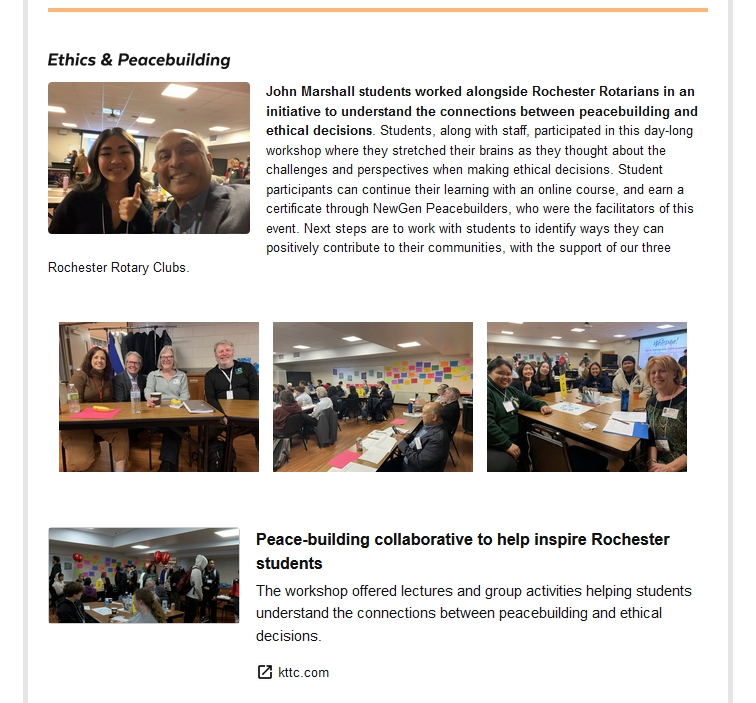 The 3-club Rochester Rotary Ethics and Peacebuilding program brings focus, tools, and encouragement to young people to participate in making their community better. And, it builds interaction between Rotarians and students, which is a win/win for both. The Rotary Ethics and Peacebuilding program included a full-day kick-off event on Feb. 12, 2024, for 66 students at John Marshall High School. Patricia Shafer, executive director of NewGen Peacebuilders, led the students in exploring a variety of perspectives around ethics. Rotarians facilitated small group activities focused on ethical decision making and taking the abstract, conceptual topics of ethics and peacebuilding and making them actionable. In the afternoon, students were introduced to the idea of “positive peace,” which is defined by the Institute of Economics and Peace as the attitudes, institutions and structures that create and sustain peaceful societies. Students then discussed videos of peace projects that other students have done and presented their views to the whole group about how the projects demonstrated one or more of the 8 Pillars of Peace. The final activity of the day was each student reflecting and writing on a card their ideal solution to a problem that is important to them. This activity exemplified the 2023-24 Rotary theme “Imagine.” The cards were attached to a balloon bouquet that was presented to the school principal. Topics identified by the students included affordable health care, food insecurity, bullying, homelessness, and many others. Throughout the remainder of the Spring semester, students enrolled in the Ethnic Studies class at John Marshall are completing 10 online modules about how peacebuilding relates to identity, diversity, justice and action. Students who complete the online modules will become certified peacebuilders from NewGen Peacebuilders.